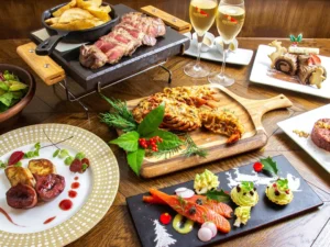 焼き加減で変わる香りや食感を、テーブルで自ら楽しむ贅沢。3種の自家製ソースと共にご堪能ください。