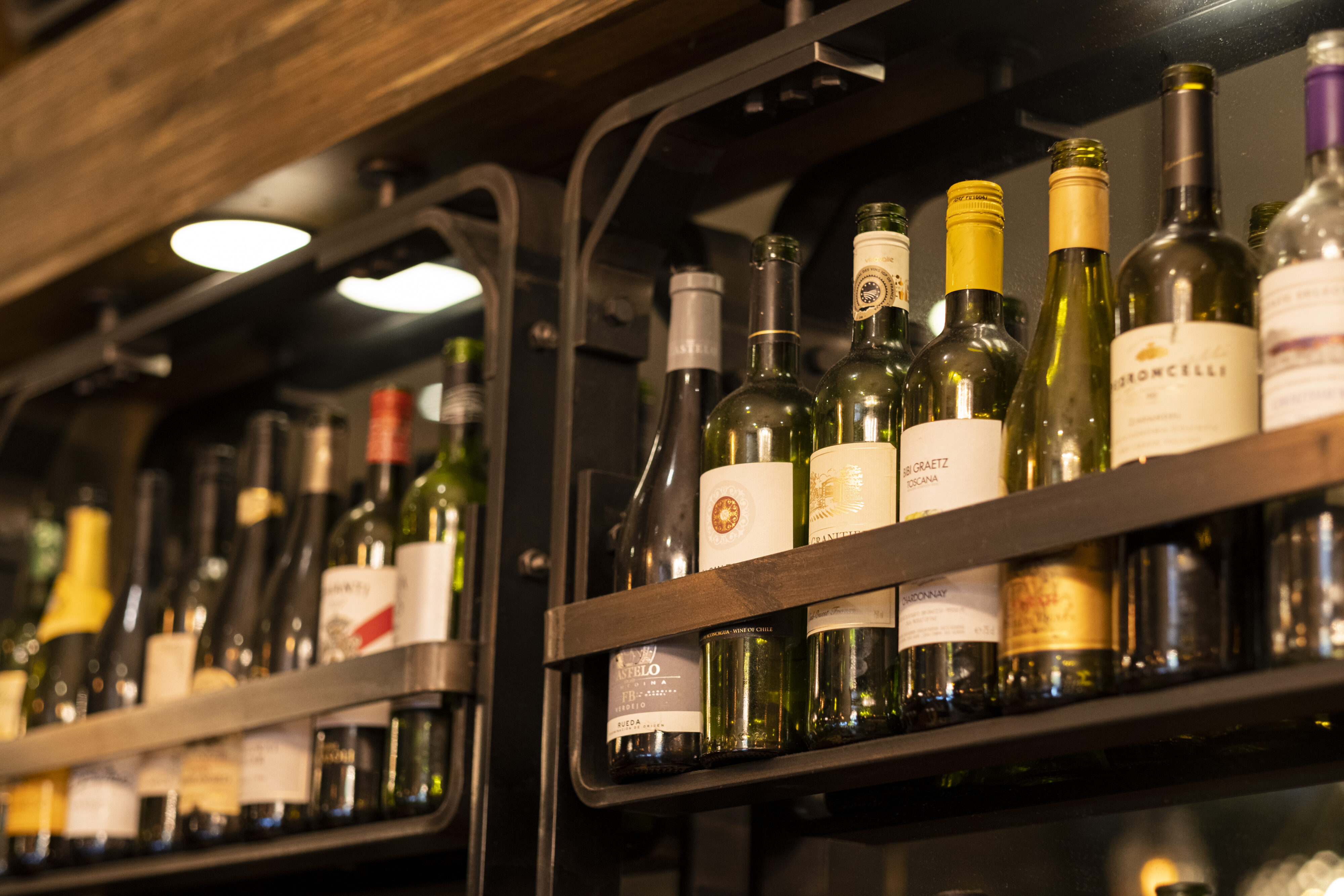落ち着いた照明とワインがずらっと並ぶおしゃれなインテリアが広がる空間で、