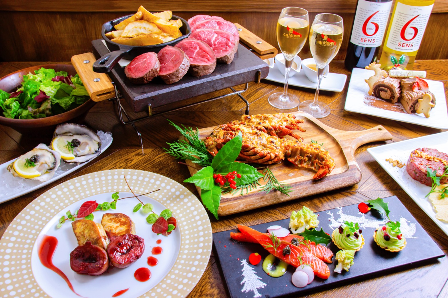 今年も街がきらきらと輝きはじめ、クリスマスのワクワクが高まってきましたね。サクレフルール日本橋店では、12/24・25だけの“とっておきクリスマスディナー”をご用意しました。テーマは「こだわりの食材 × 職人技」。国産牛ヒレステーキ、生牡蠣、鮑、オマール海老、フォアグラなど、豪華食材を使った全9品コースです。乾杯シャンパン付きで、特別な夜をさらに華やかに演出します。